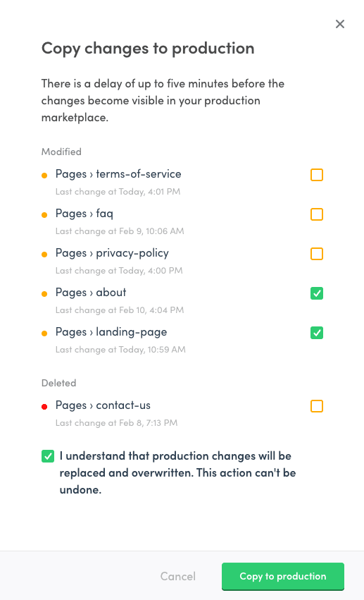 To see your changes in your live marketplace, you must copy the changes you made from your Development environment to your Live environment. Click the “Copy to live…” button and then select the specific pages that you want to copy. This will transfer all the content from the current environment to your Live environment.