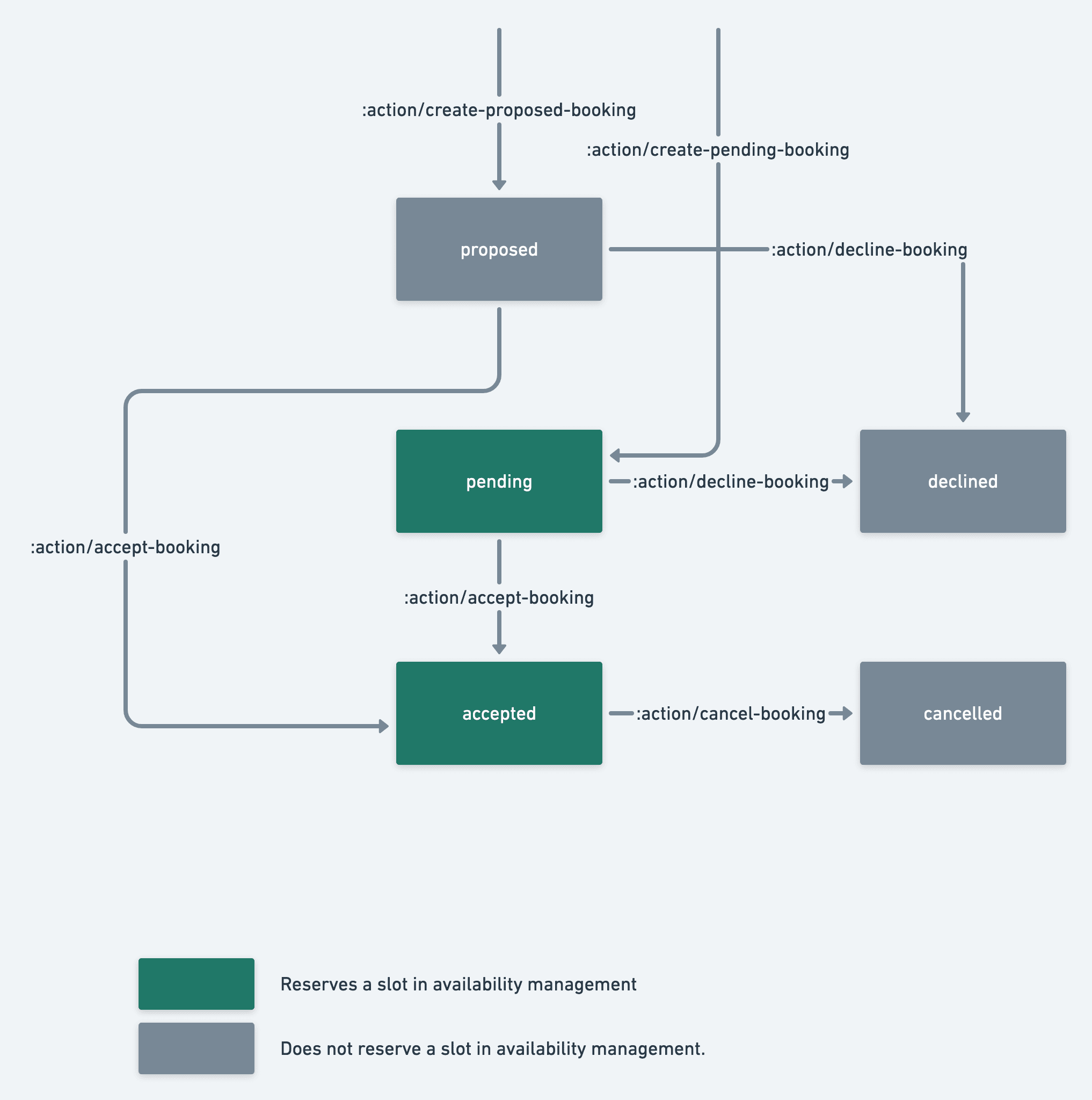 A booking can be in one of several possible states: pending, proposed, accepted, canceled or declined. Bookings change state only through a corresponding transaction transition, using one of the booking-specific actions.